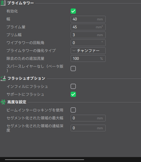 ソフトの計算上では「インフィルにフラッシュ」の設定が