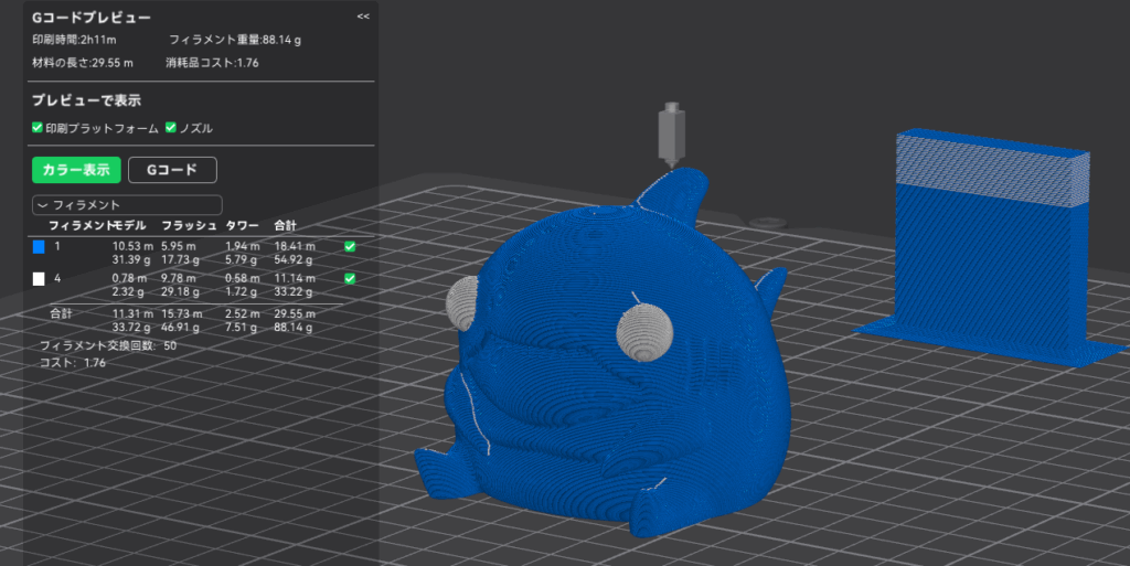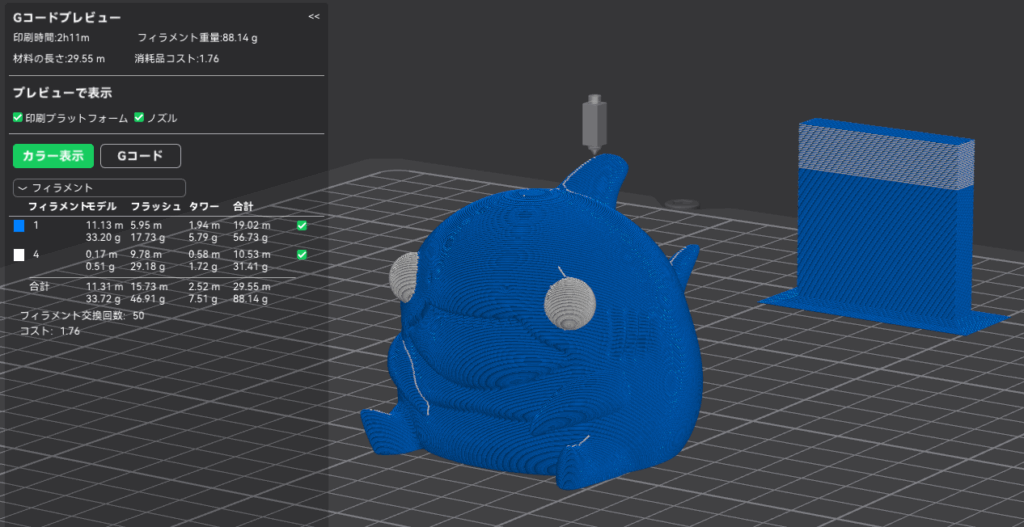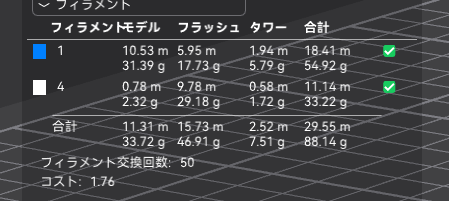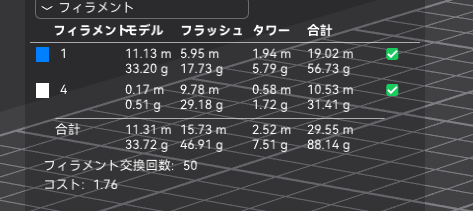 対して、パージの際に廃棄される材料(フラッシュ)は46.91g、ワイプタワーに使用される材料は7.51gでなんと約1.6倍の廃棄材料ができます。